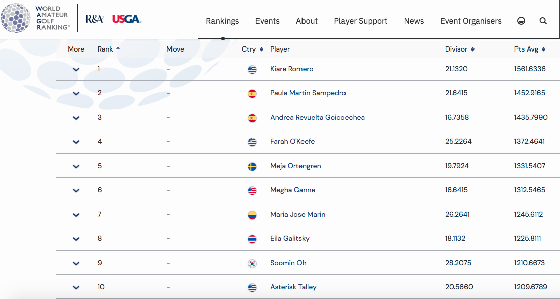 I do predict that the winner of ANWA in 2026 will be one of the top 10 women in amateur golf. Below is a screenshot of the current top 10. Many will have their money on Kiera Romero, the #1 amateur player in the world but I have my eye on three other players.