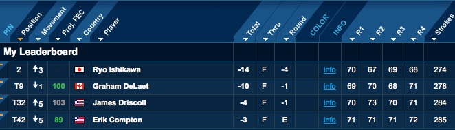 The one thing that I did not like about the league was that the leader-board only showed the ranks for the top 100 and did not show the total number of players. So you could compare yourself to the top 100, the people in your own league, and the Golf Channel experts but that was it. Therefore, knowing my final rank was mid-5,000 really did not mean anything since I had no basis for it expect that I clearly was not in the top 100. But I would have liked to know where I was against all players. I actually wrote the golf channel fantasy team an email at the end of the season and suggested they add the total number of players. Now, they may have been planning it all along but the new player profile includes your overall rank against everyone.
