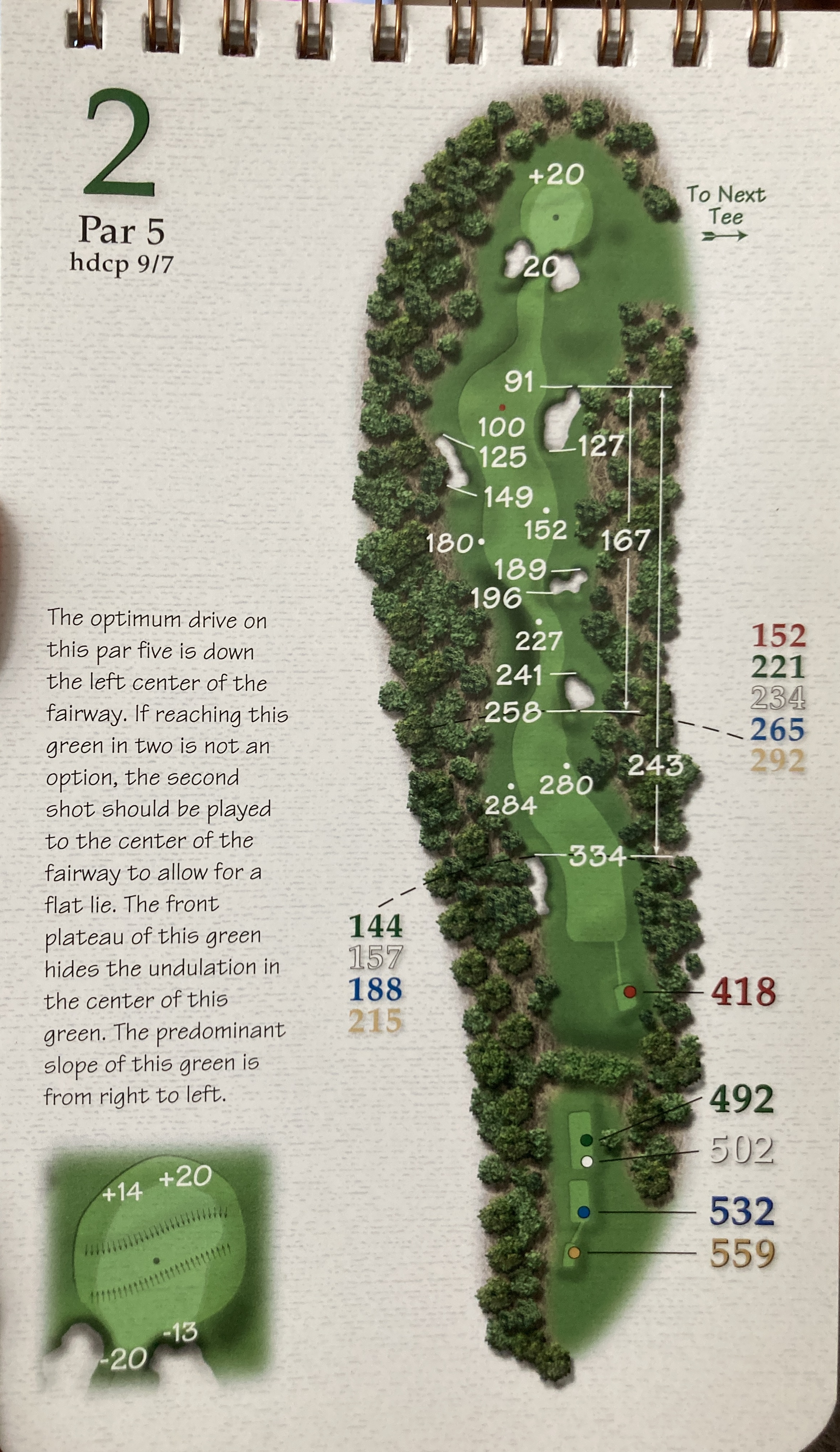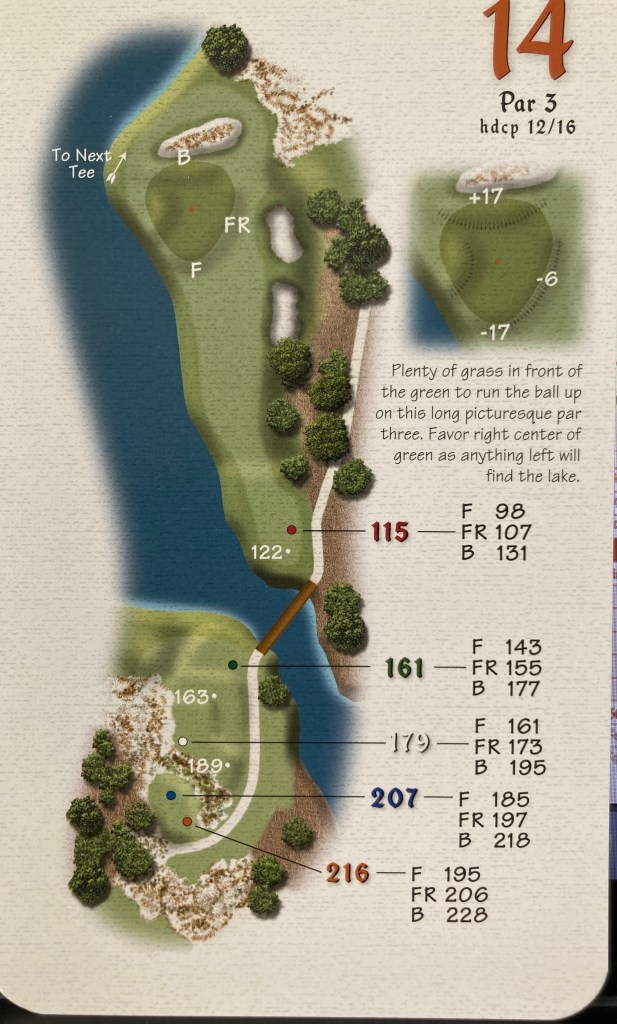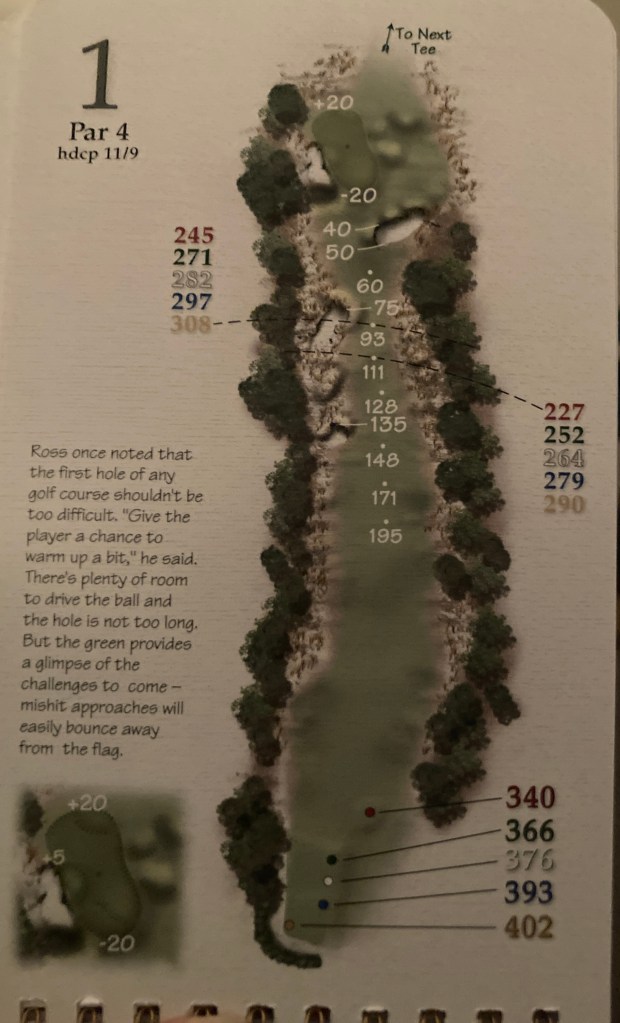 By the Numbers – All the courses were beautiful, in excellent condition, and challenging to play. To get a sense of the challenge of the courses I looked up the ratings for each on the USGA National Course Rating Database (see the chart below). For my non-golf friends, the first number is an indication of the course difficulty for a scratch golfer (e.g., if par is 72 they play to that number) and the second number is “slope” and indication of the relative difficulty of a golf course for players who are not scratch players compared to players who are scratch players. And the USGA also provides a potential score for bogey golfers. The USGA course rating system lists a male bogey golfer as a 20 handicap and a female bogey golfer as a 24 handicap. For my golfing friends that are wondering about the handicaps — the USGA course rating uses driving distance in determining bogey handicaps (and states the average drive for females is 150 yards). So if you are a female with a 24 handicap index you can set an expectation of a score of 103 (or about three strokes over your “target score” calculated as the course par plus your course handicap: 72+28=100). I personally like to use the GHIN app and look up my course handicap (which is the strokes you get for that course and is not the same as your handicap index) to calculate my target score.