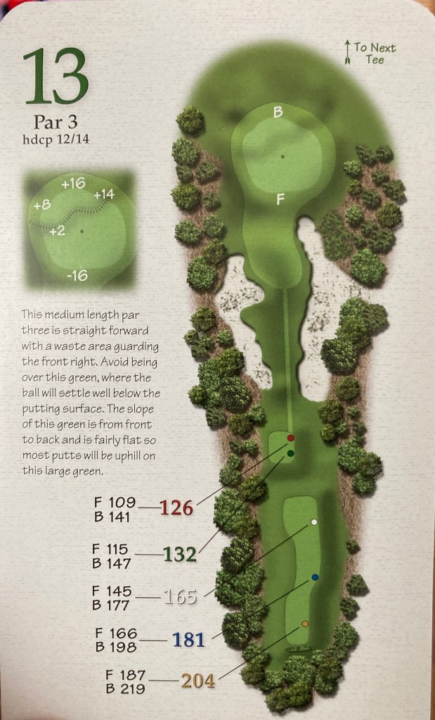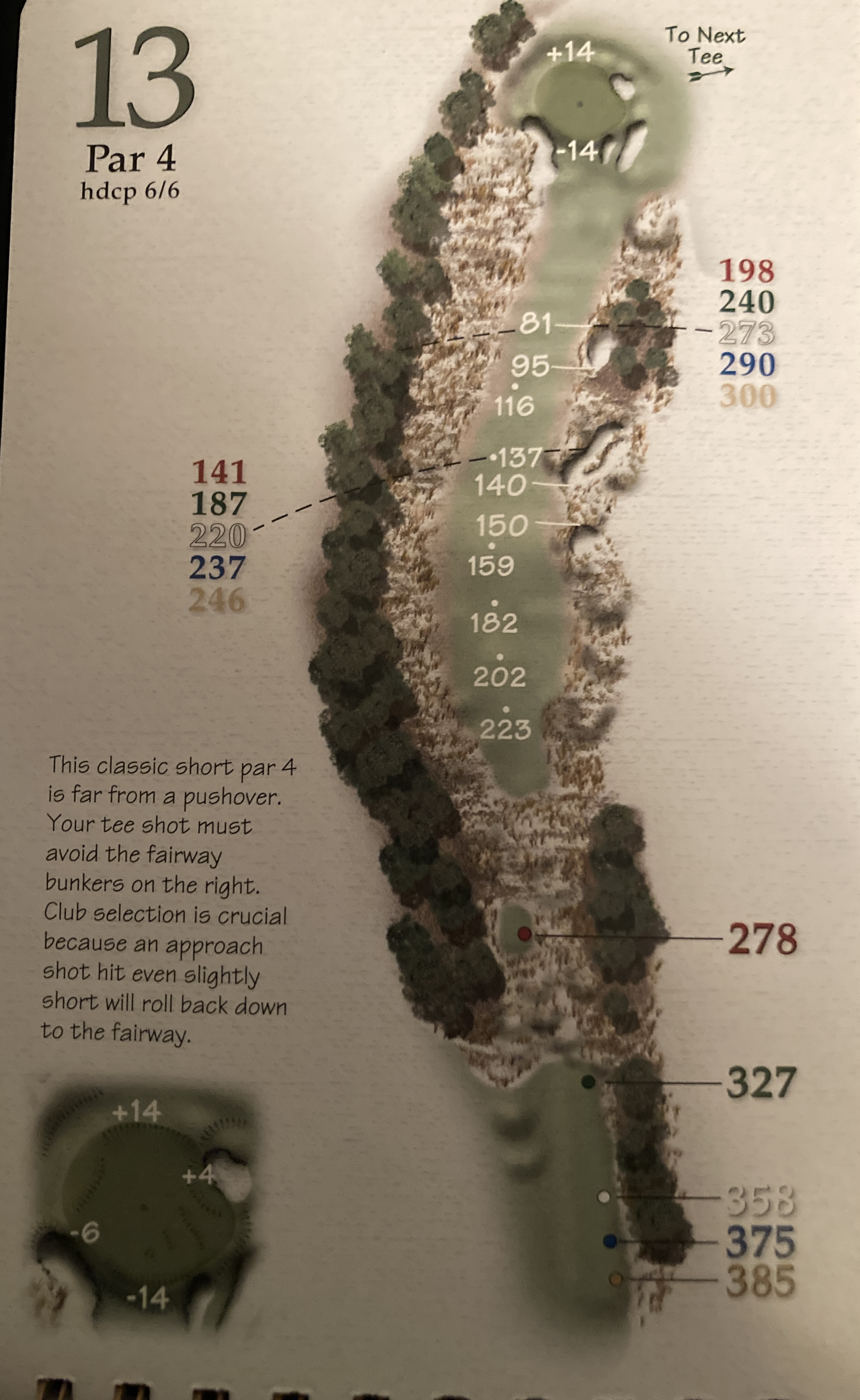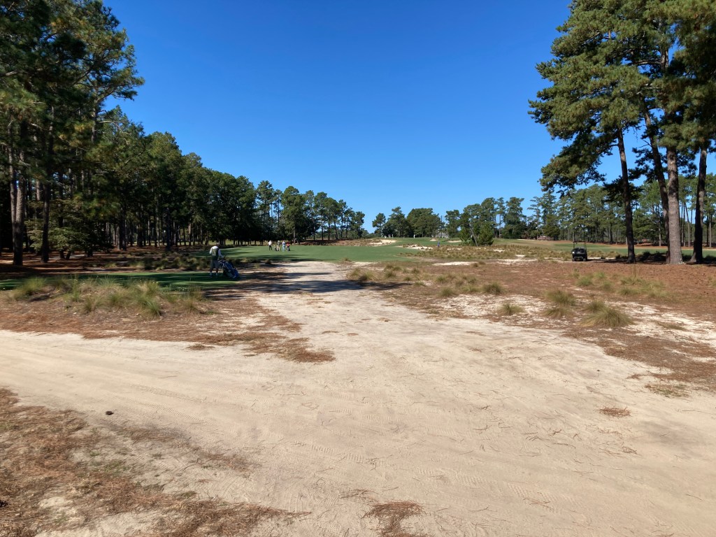 The defense of the course in my opinion was the length (especially on the Par 4 holes) and the sand and grass in the waste areas. After playing #2 and #4, we decided it was much harder to advance your ball out of the waste areas on Pinehurst #4 because the sand was sort of soft and fluffy and the grass was more spread out. Comparatively, the sand in the waste areas at Pinehurst #2 was hard packed. But it really was the distance on some very long par 4 holes on #4 that seemed almost unfair; even my caddie would say to me you can’t get on this par 4 in two (and I was hitting my drives great that day for me at 170-180 yards and my 3 wood 130-140 yards but not reaching a par 4 at 340 or 356 yards). On the bright side, the Par 3s distances were reasonable ranging 90 to 135; but again for any short hitter they would be looking at a hybrid or wood to get on in regulation on the longer par 3s.
