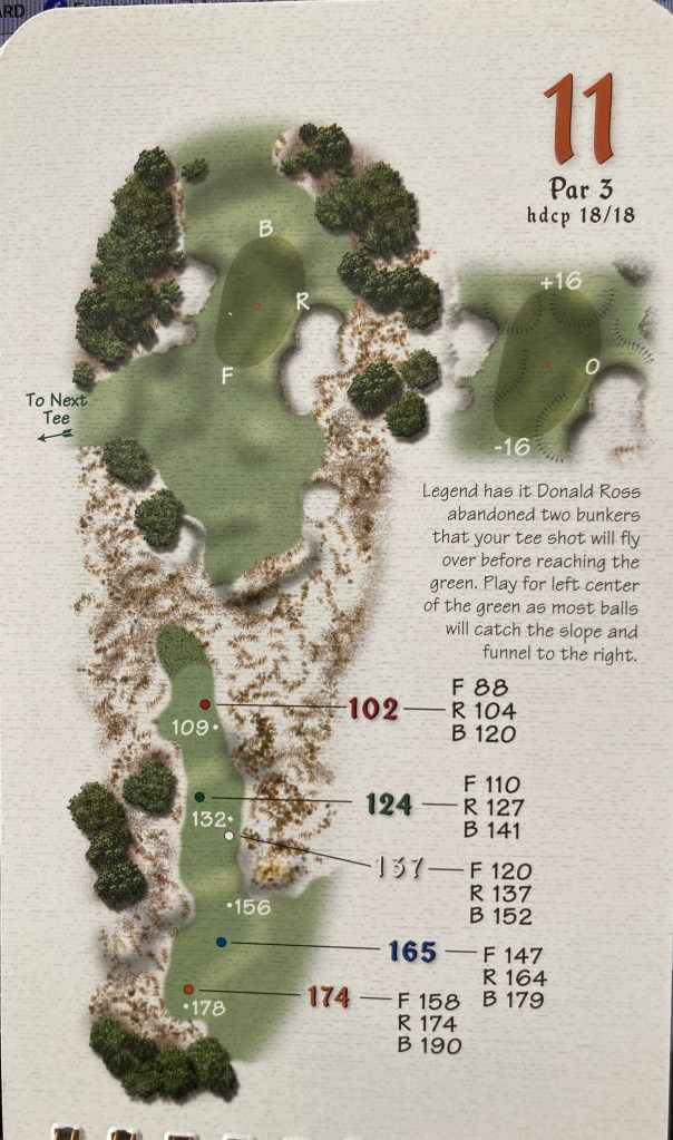The Chart below shows that Pinehurst #2 is the hardest course. As a non-scratch golfer, I care about the slope of 133 (which is fairly significant against an average course rating slope of 113). Also, the bogey rating is 103.3 for Pinehurst #2. It is interesting that the front 9 slope is easier than the back 9 slope because the caddie said the first six holes of Pinehurst #2 are the hardest.