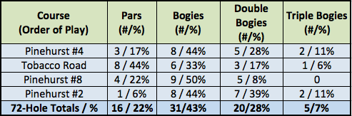 If I look at my pars, bogies, etc. by course (which is a stat in GHIN if you post hole-by-hole with stats), I’m really happy with the results for the four rounds (72 holes) resulting in 65% Bogies or Better (Pars 22% and Bogies 43%).