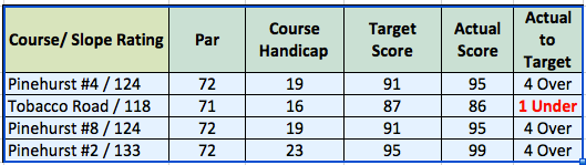 My Game Overall – So you may be wondering how I did based on the opinions above. I will share with you that I really prepared (practicing every part of my game, taking lessons, etc.) the weeks before this trip. My lowest score was at Tobacco Road with a 86 (with eight pars, six one-putts) which was one stroke better than my target score; but I played well all week and basically played within four strokes of my target scores for each Pinehurst course which means (according to USGA guidelines of four strokes within your target score) I played to my ability – see the chart below – courses are in order of play.